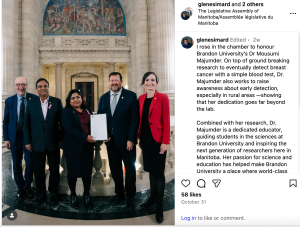 October 31, Honourable Minister Mr. Glen Simard recognized Dr. Majumder at the Manitoba Legislature.